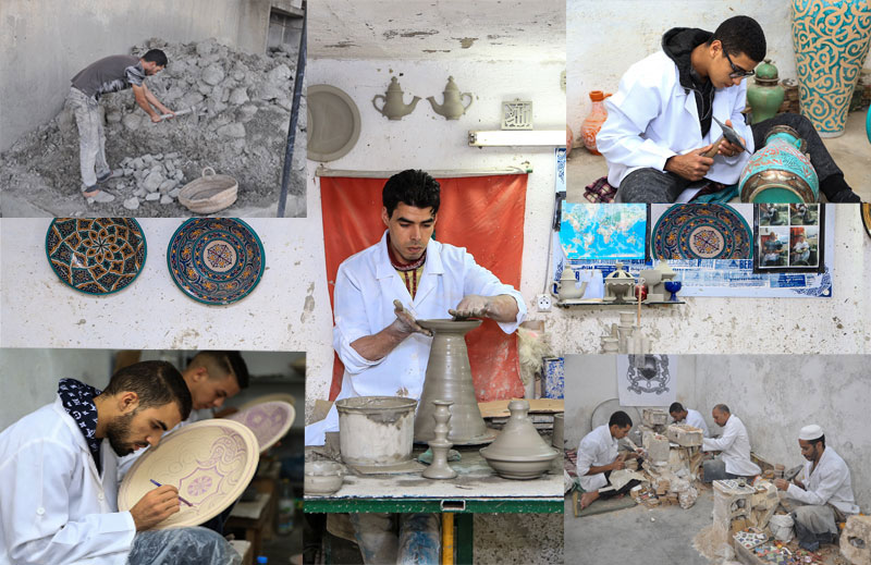 Comme toutes les poteries du monde, l’artisan fassi se sert d’ébauchoirs en bois ou en roseau, de morceaux de cuir très souple pour le lissage et d’une ficelle pour détacher l’objet une fois tourné. Les poteries sont d’abord séchées à l’air libre puis rangées dans le four pour subir une première cuisson puis dessin des motifs, et peinture suit d’une dernière cuisson pour avoir les objets finis et emailés.